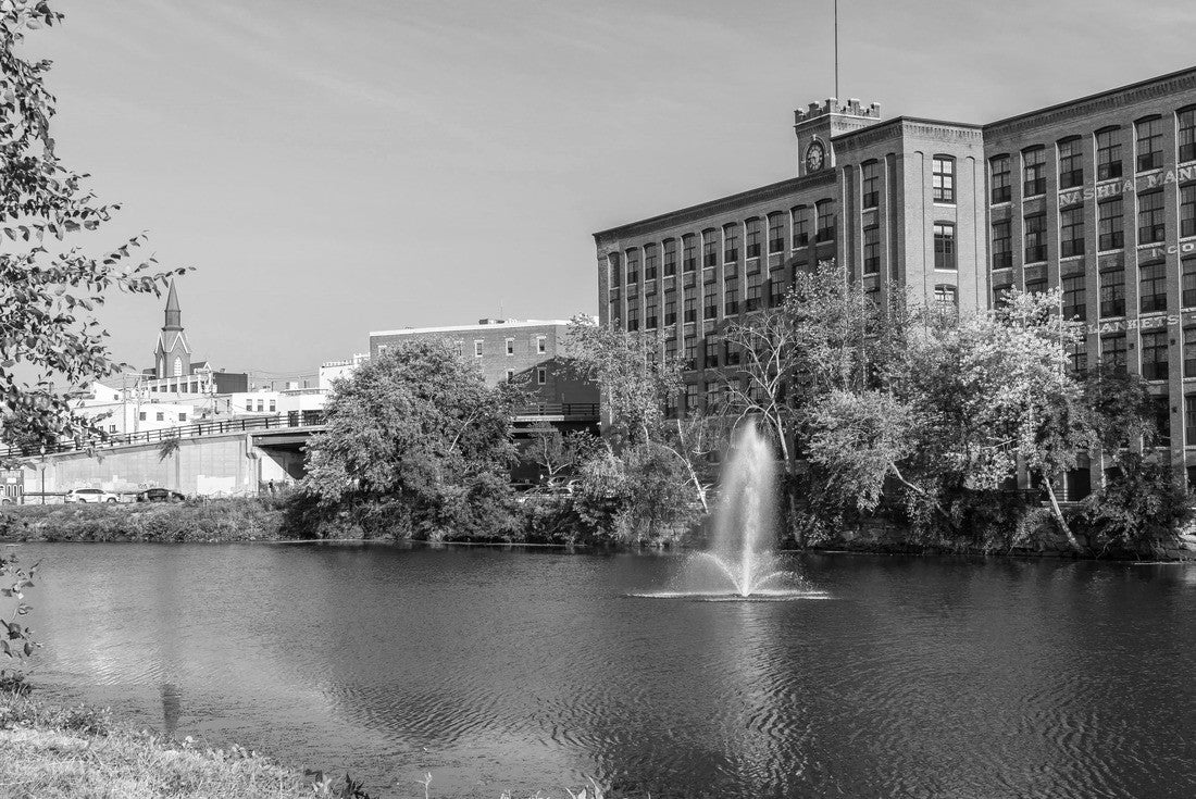 Noah Jigsaw Puzzle Fountain on the Nashua River against the background of a historic cotton factory building with a clock tower in the old industrial park of Nashua. New Hampshire, USA in black white 2000 pieces