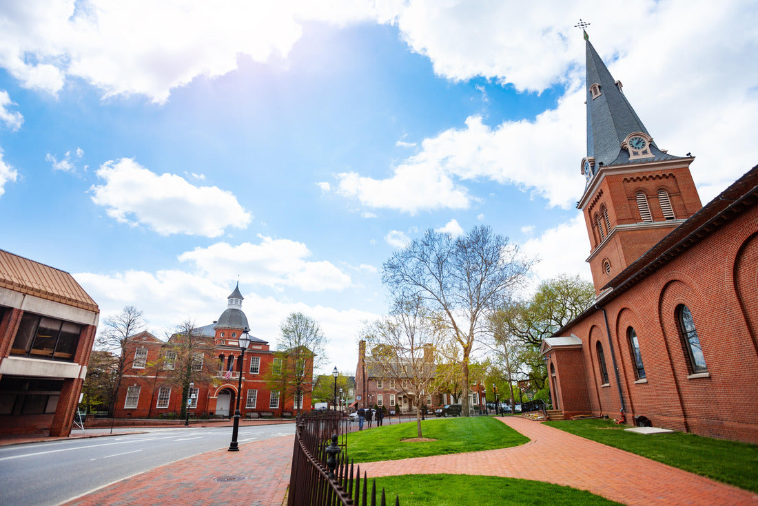 Noah Jigsaw Puzzle Government House and St. Anne's Parish Episcopal church in Annapolis MA with old tree branches at spring, Maryland USA 2000 pieces