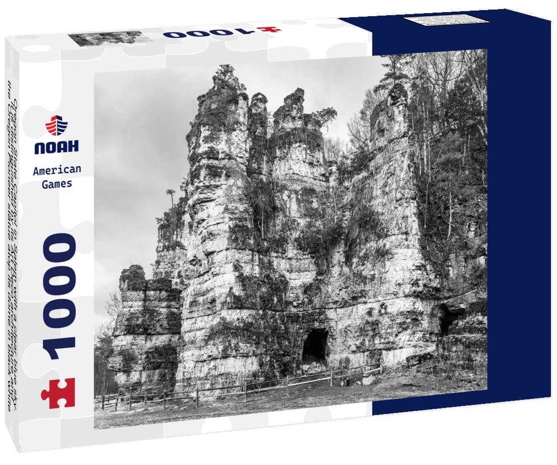 Noah Jigsaw Puzzle Oregon State Capitol in Salem with a clear blue sky. It is distinguished by its Art Deco architecture and the Oregon Pioneer statue atop its dome in black white 1000 pieces