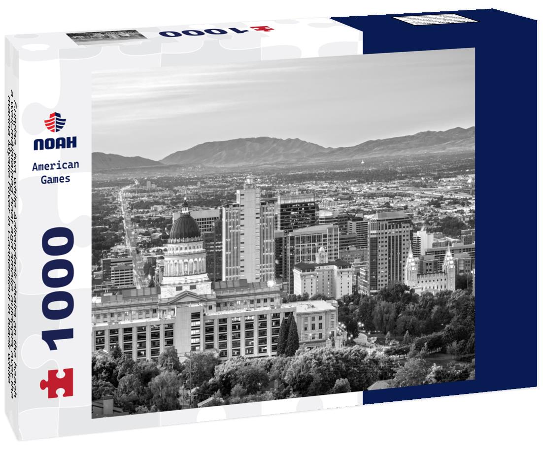 Noah Jigsaw Puzzle Sunrise, two white Adirondack chairs on the beach, a well-maintained boat and smoke outdoors over the marina Mystic River in Connecticut in black white 1000 pieces