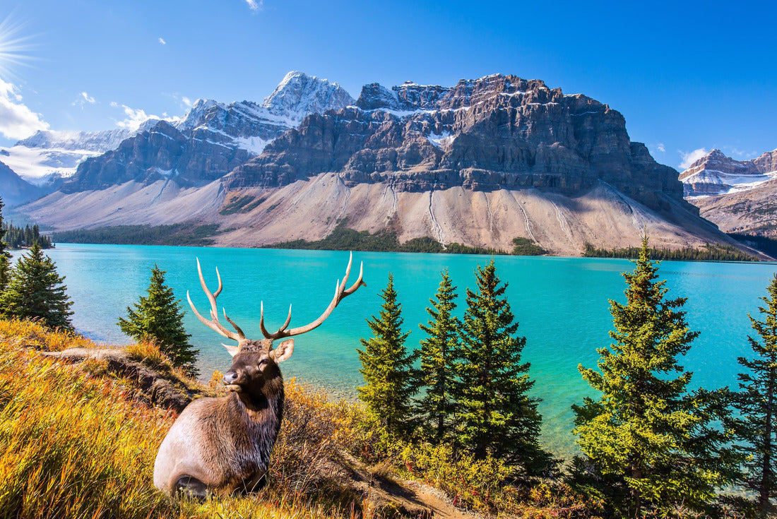 Noah Jigsaw Puzzle The deer with ramified anthrax rests in the tall grass. Pine trees around the glacial lake Bow. The majestic rocky mountains of Canada 2000 pieces