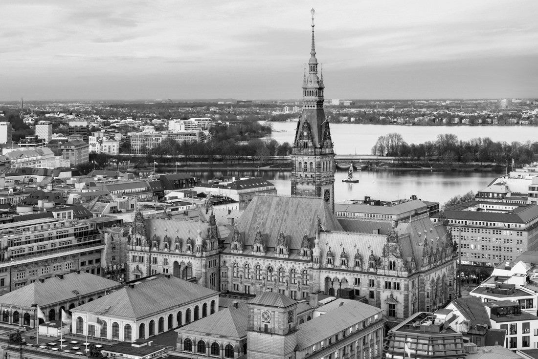 Noah Jigsaw Puzzle The Hamburg City Hall (German: Rathaus) with downtown and the lake Alster at dusk in black white 2000 pieces