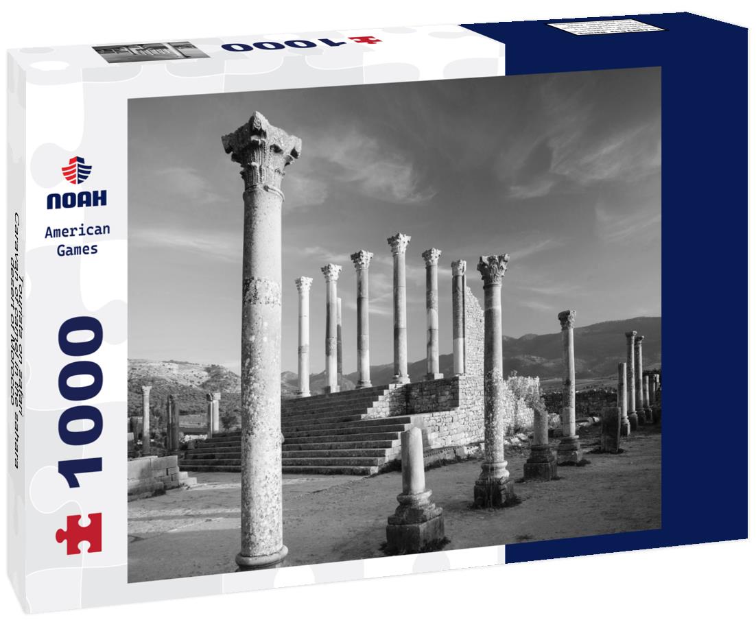 Noah Jigsaw Puzzle Tourists on safari - Caravan of camel in the sahara desert of Morocco - General view of the Merzouga hotels district - Morocco, Africa in black white 1000 pieces
