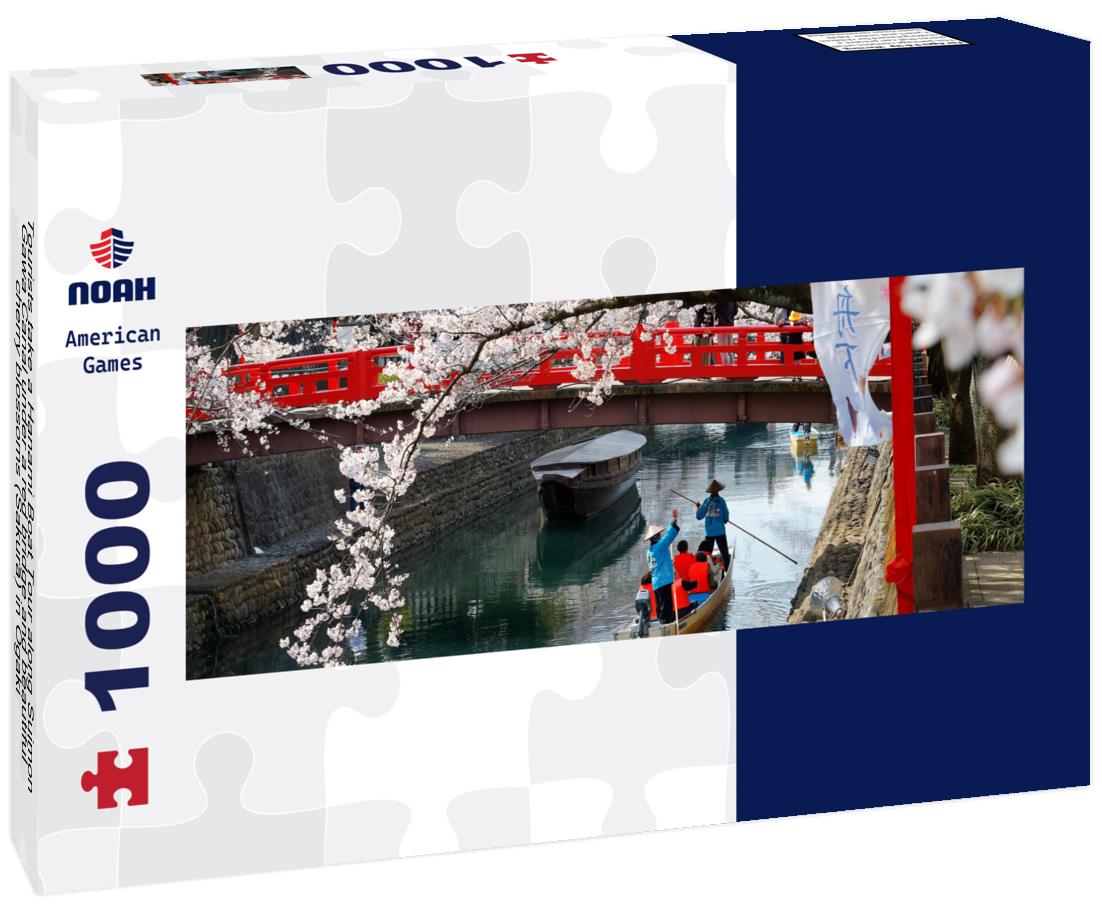 Noah Jigsaw Puzzle Tourists take a Hanami Boat Tour along Suimon-Gawa Canal under a red bridge and beautiful cherry blossoms (Sakura) in Ogaki panorama 1000 pieces