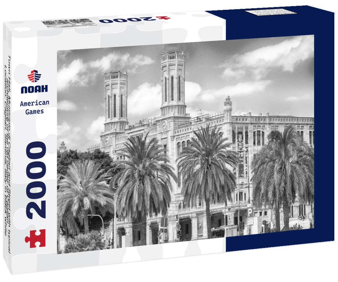 Noah Jigsaw Puzzle Town Hall, Municipio di Cagliari and Street with typical architecture of the old center of Cagliari. Location: Cagliari, Sardinia, Italy in black white 2000 pieces