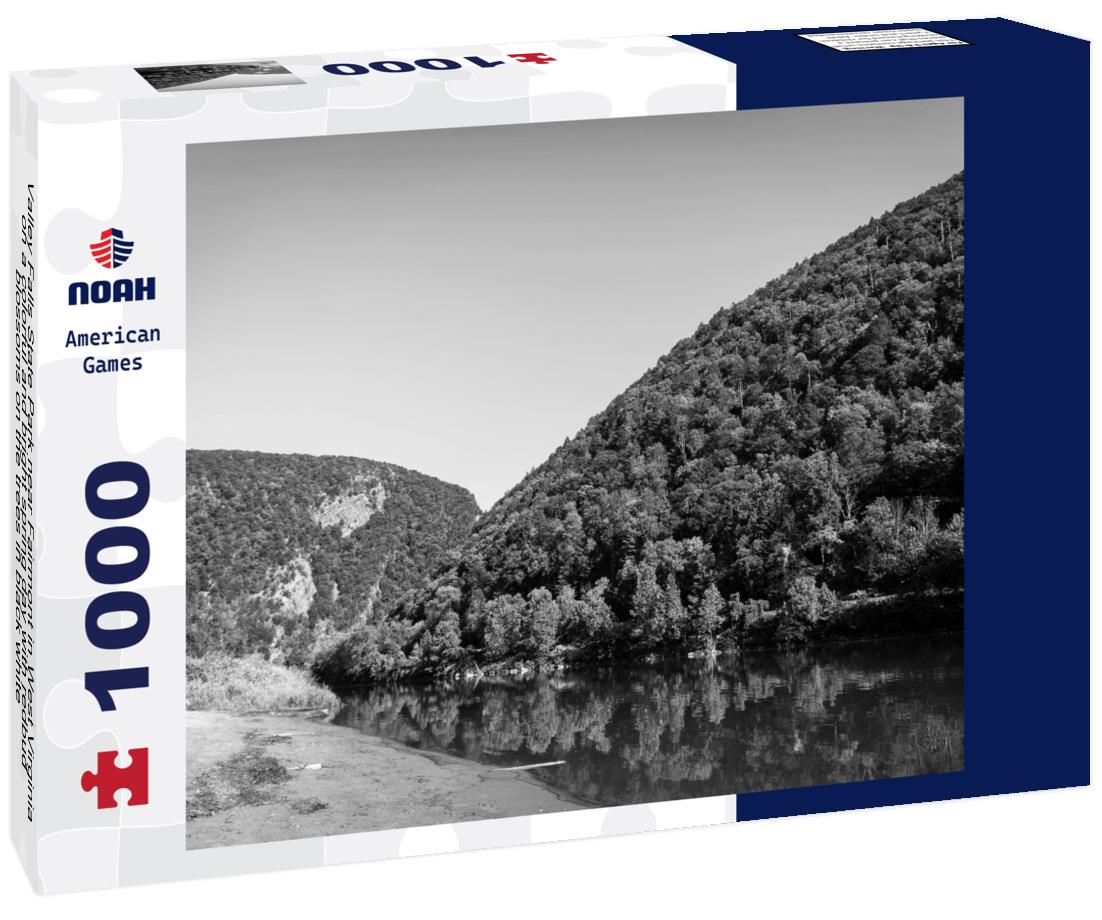 Noah Jigsaw Puzzle Valley Falls State Park near Fairmont in West Virginia on a colorful and bright spring day with redbud blossoms on the trees in black white 1000 pieces
