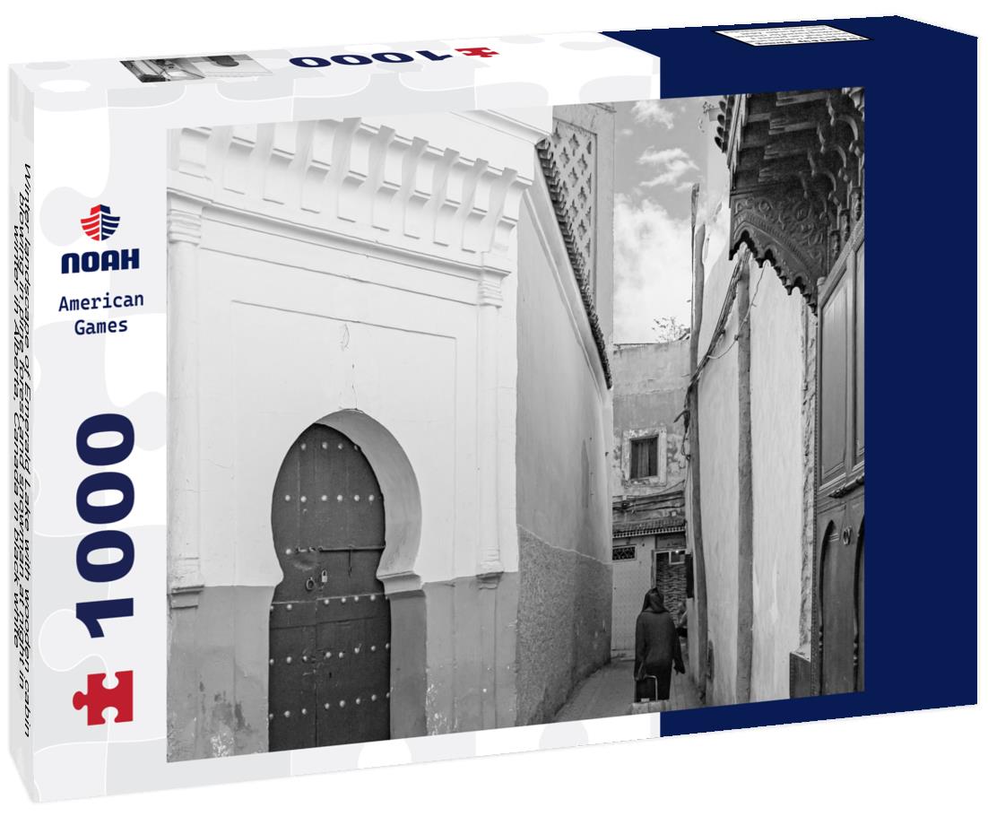 Noah Jigsaw Puzzle Winter landscape of Emerald Lake with wooden cabin blowing in pine forest and snowman at night in winter in Alberta, Canada in black white 1000 pieces