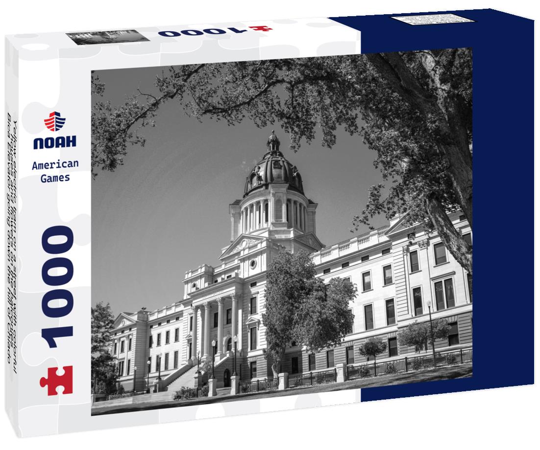 Noah Jigsaw Puzzle Yellow electric tram on a street with colorful houses and flowers on the balconies - Bica Elevator going down the hill of Chiado in Lisbon, Portugal in black white 1000 pieces